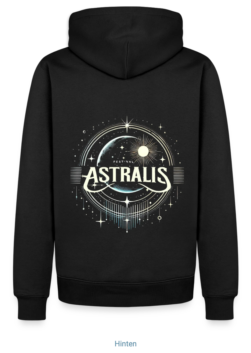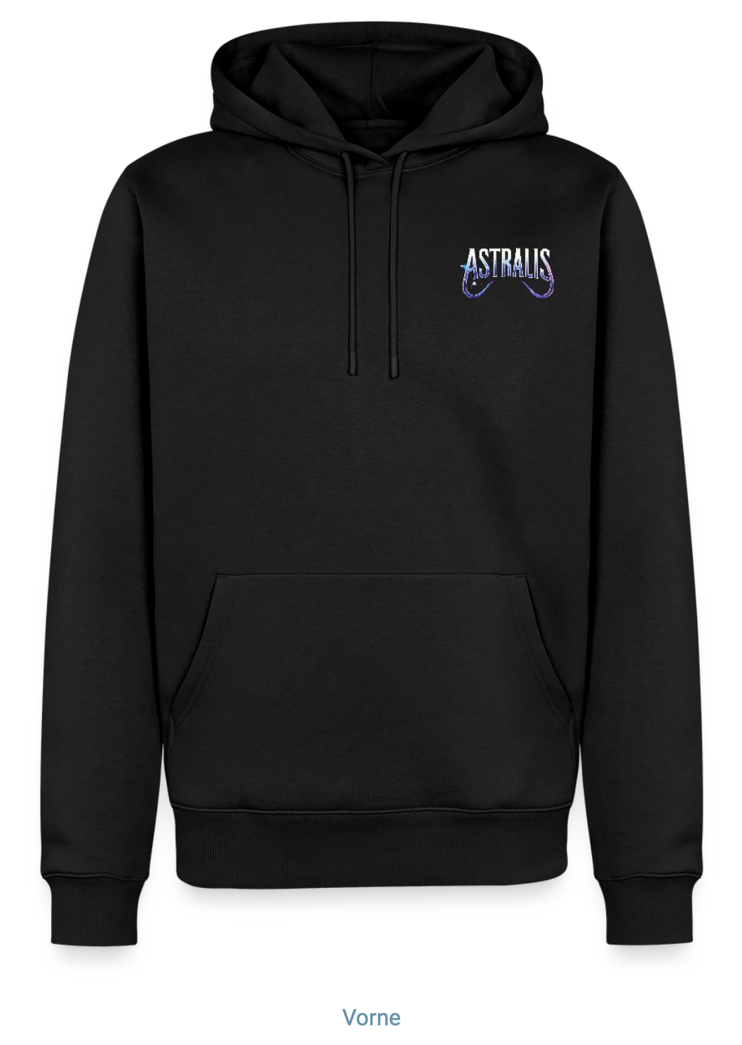 Der Schwarz Farbene Hoodie mit dem Astralis Schriftzug Vorne und dem Astralis Logo auf der Rückseite